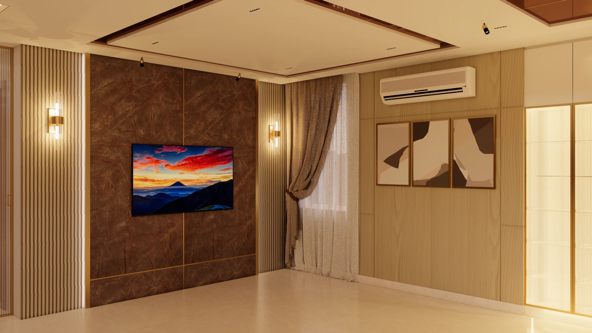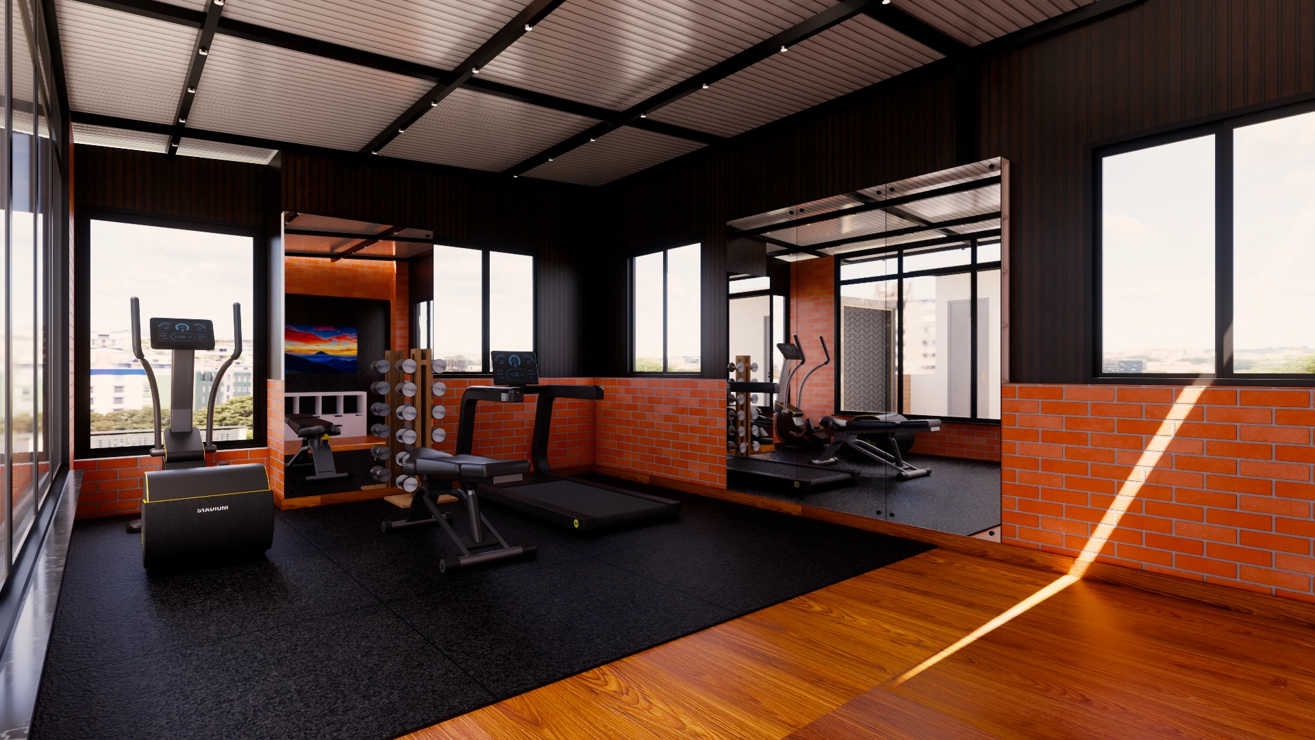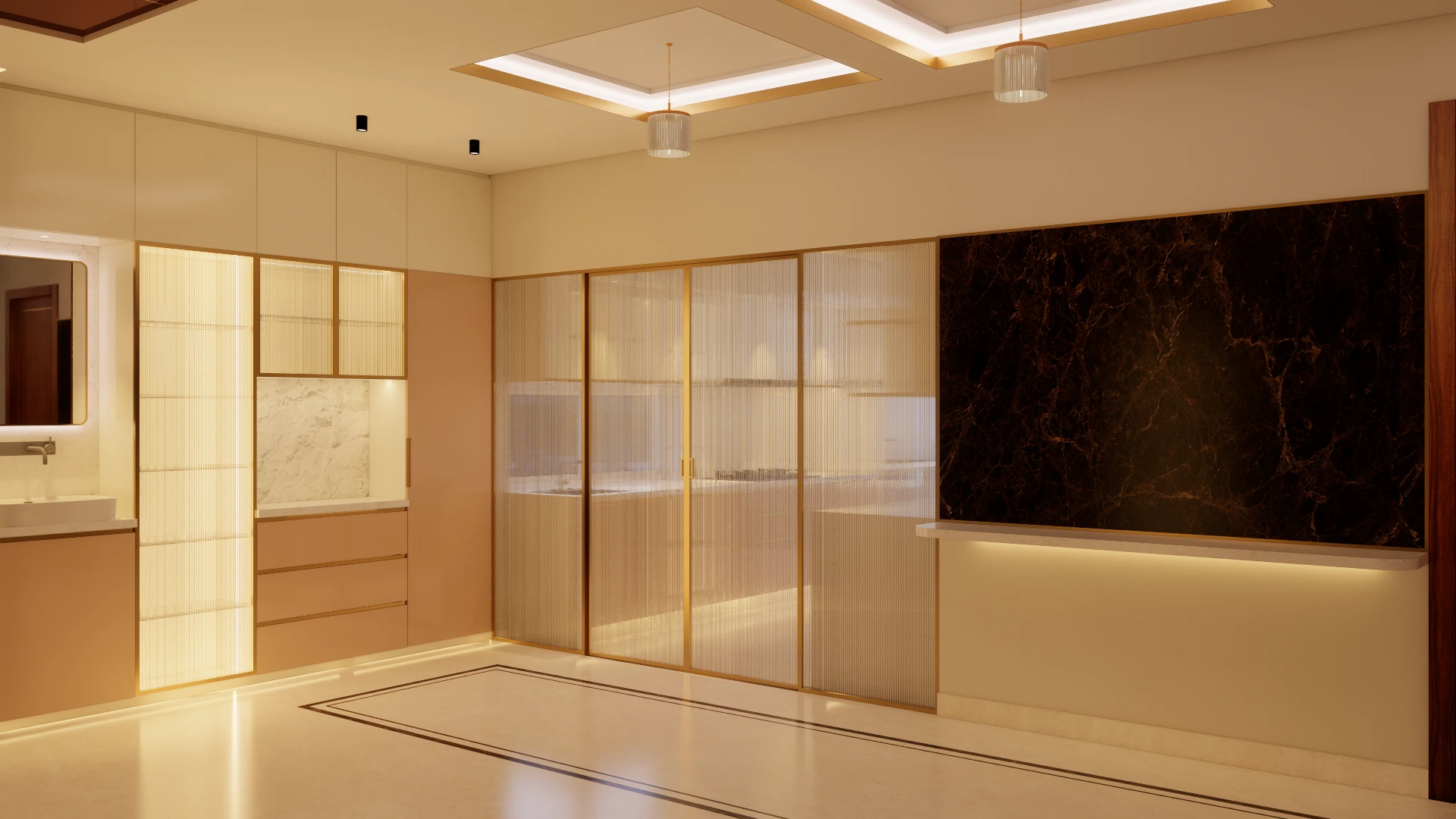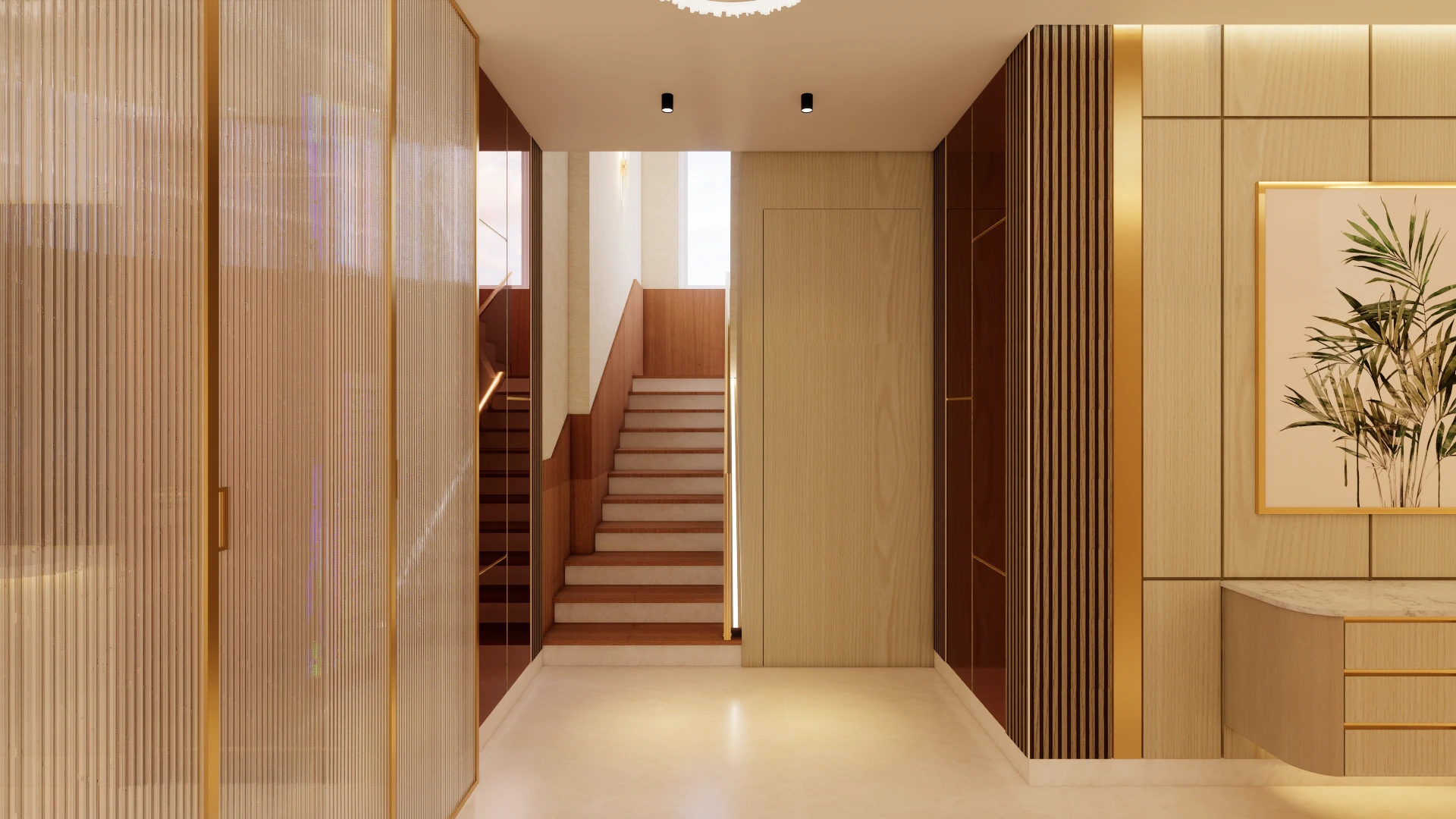 The building’s facade is defined by contemporary elegance and a striking use of geometric balance. A rich palette of materials, including warm-toned textures, creates a sophisticated exterior that is both visually striking and inviting. Inside, this modern sensibility continues through a series of spaces designed for both comfort and style. From the sleek, minimalist kitchen to the luxurious master bedroom and the dedicated home theater, each area is designed with clean lines and a curated mix of textures and lighting. The common spaces, like the residential gym and party hall, extend this feeling of urban sophistication, while intimate touches like the prayer corner and foyer provide a sense of personal sanctuary.