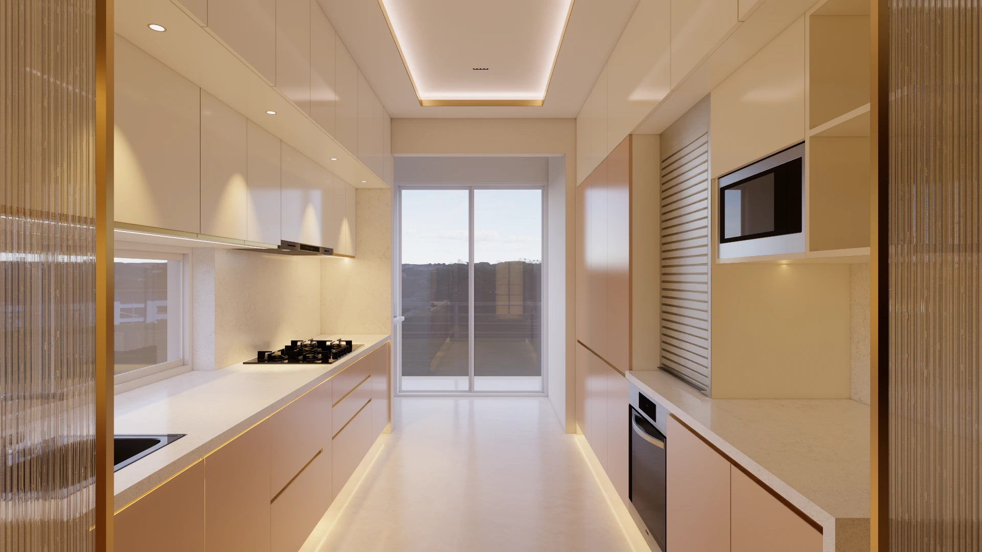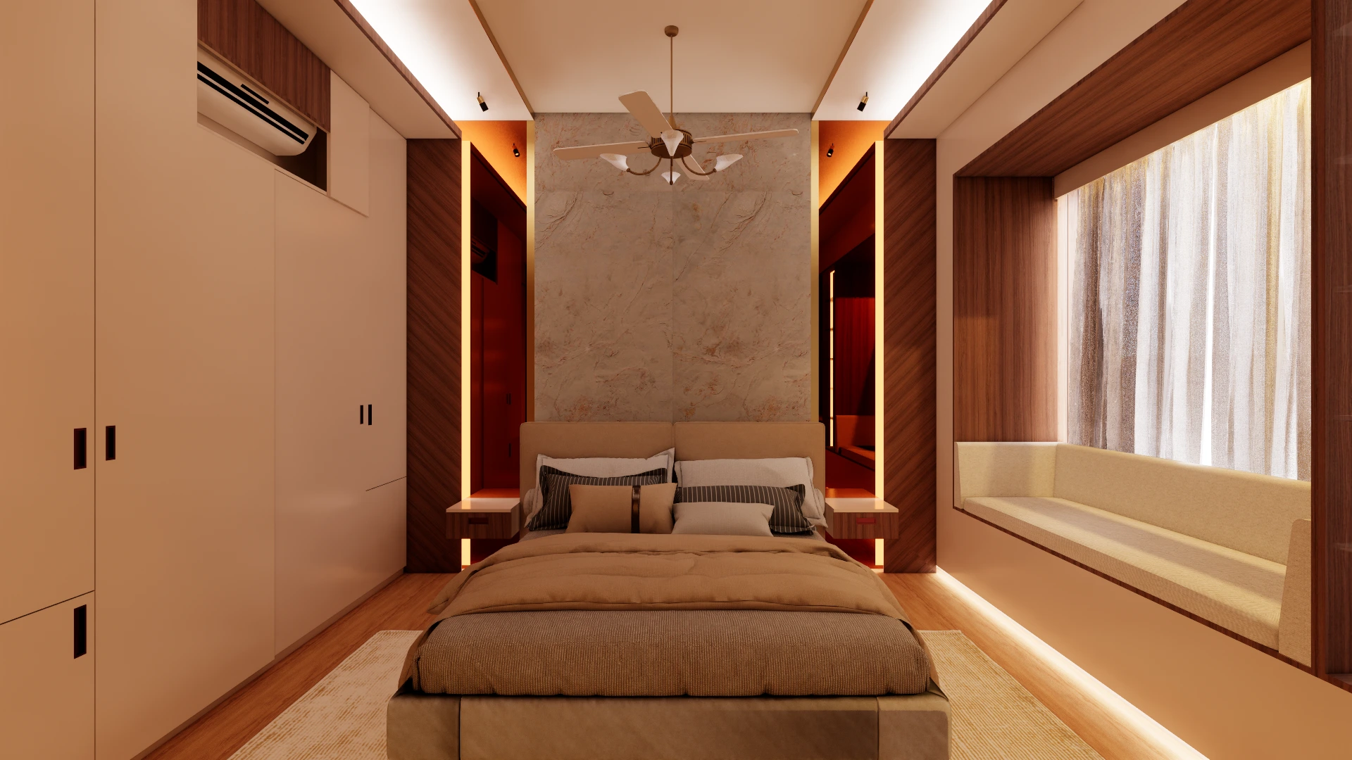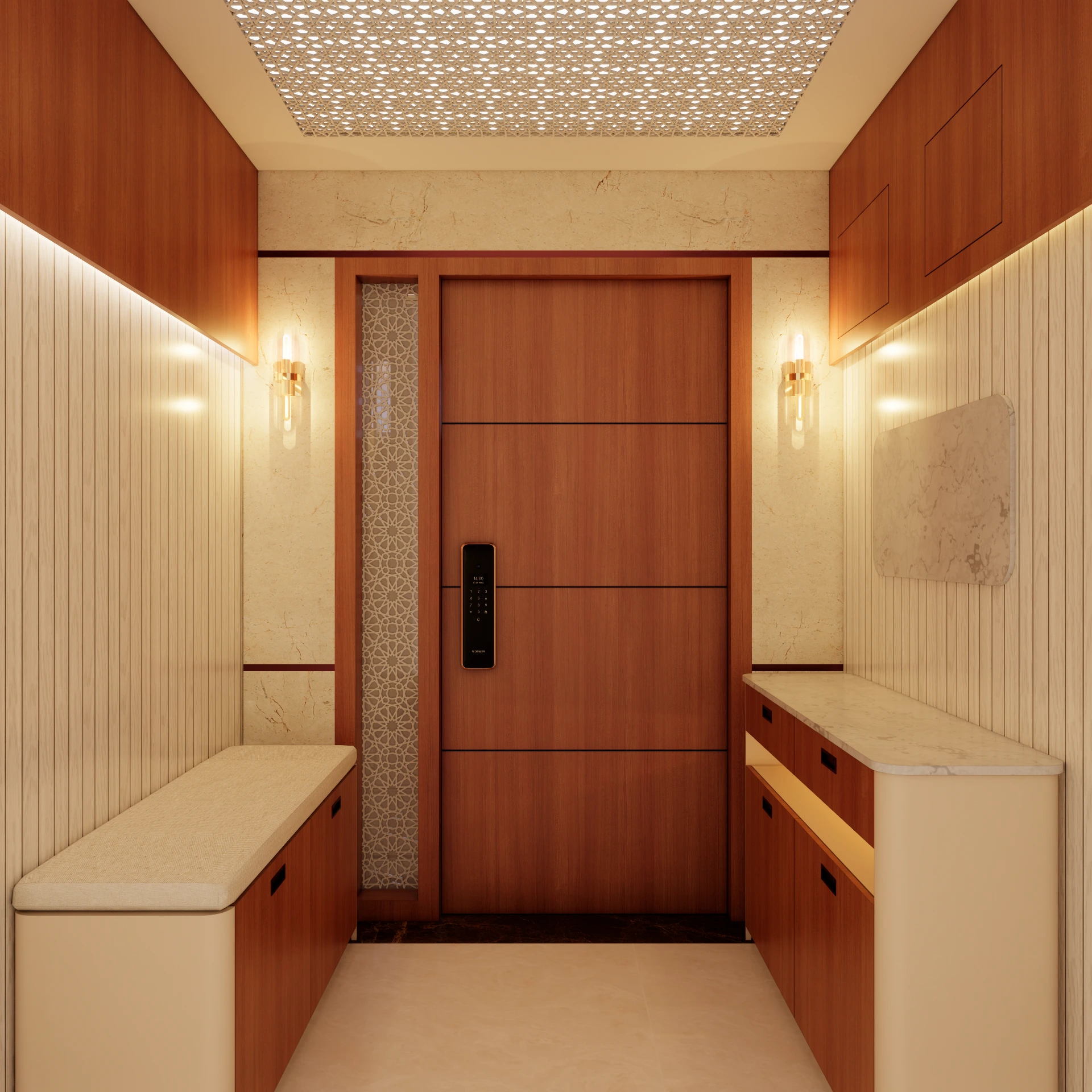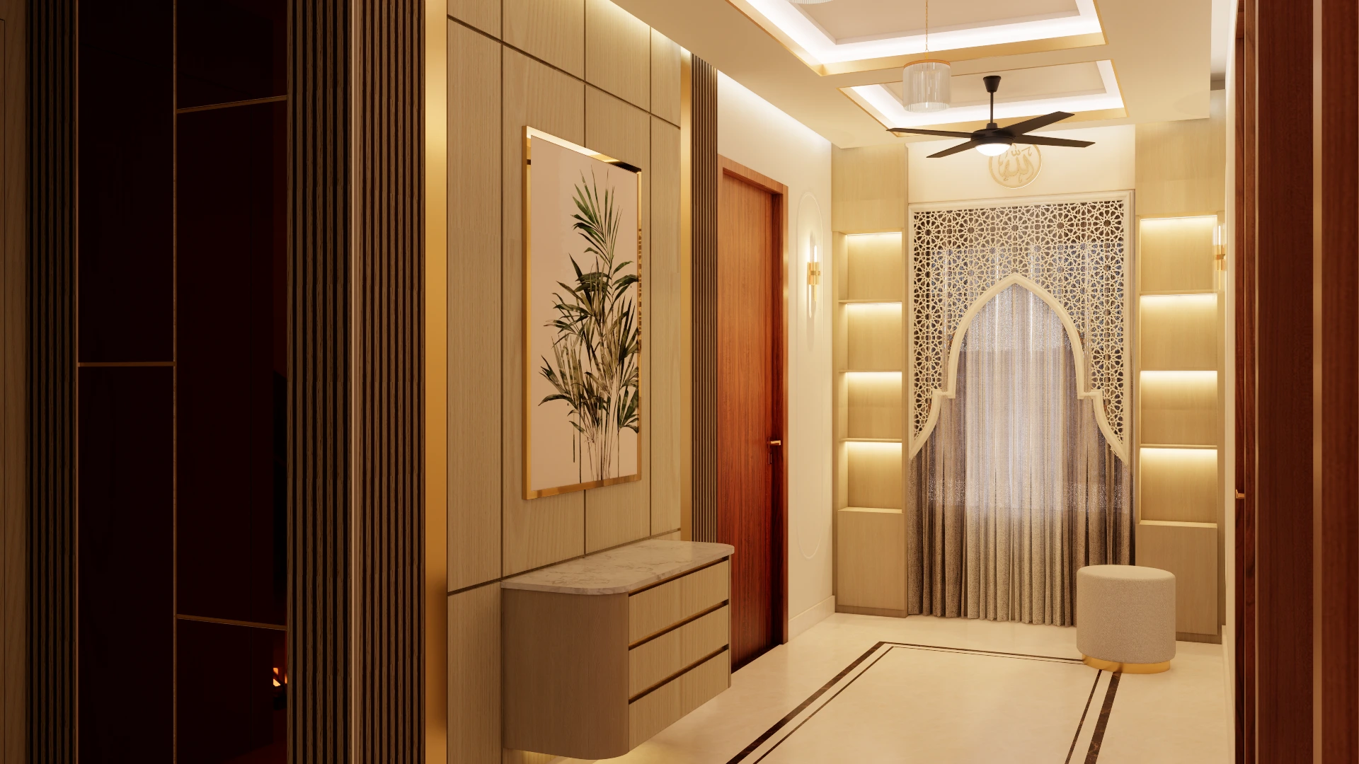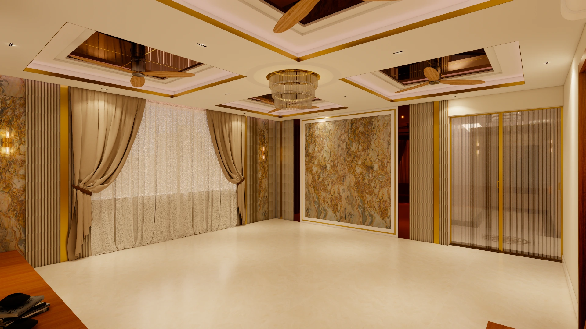 The building’s facade is defined by contemporary elegance and a striking use of geometric balance. A rich palette of materials, including warm-toned textures, creates a sophisticated exterior that is both visually striking and inviting. Inside, this modern sensibility continues through a series of spaces designed for both comfort and style. From the sleek, minimalist kitchen to the luxurious master bedroom and the dedicated home theater, each area is designed with clean lines and a curated mix of textures and lighting. The common spaces, like the residential gym and party hall, extend this feeling of urban sophistication, while intimate touches like the prayer corner and foyer provide a sense of personal sanctuary.